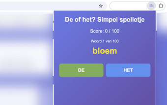 De of het? Simpel lidwoordenspelletje is een gratis Chrome-extensie die gebruikers helpt bij het leren van Nederlandse lidwoorden door middel van een interactief spel. Het spel biedt een gebruiksvriendelijke interface waarin spelers moeten raden of een woord het lidwoord 'de' of 'het' vereist. Na elke poging ontvangen spelers directe feedback, inclusief een voorbeeldzin, wat het leerproces vergemakkelijkt. De extensie is eenvoudig te installeren via de Chrome Web Store en kan offline worden gebruikt na de eerste API-oproep.